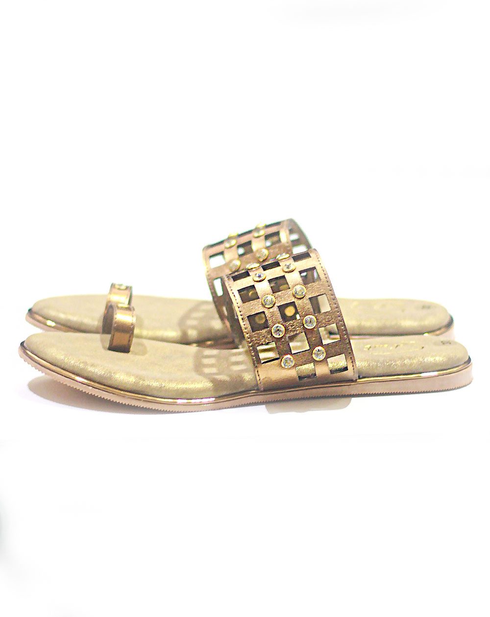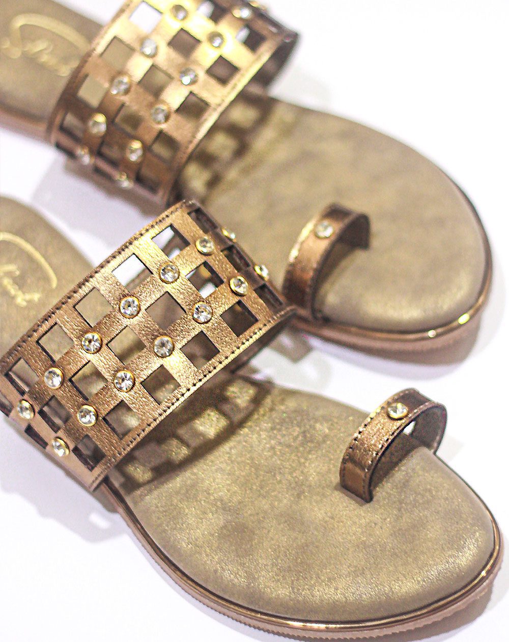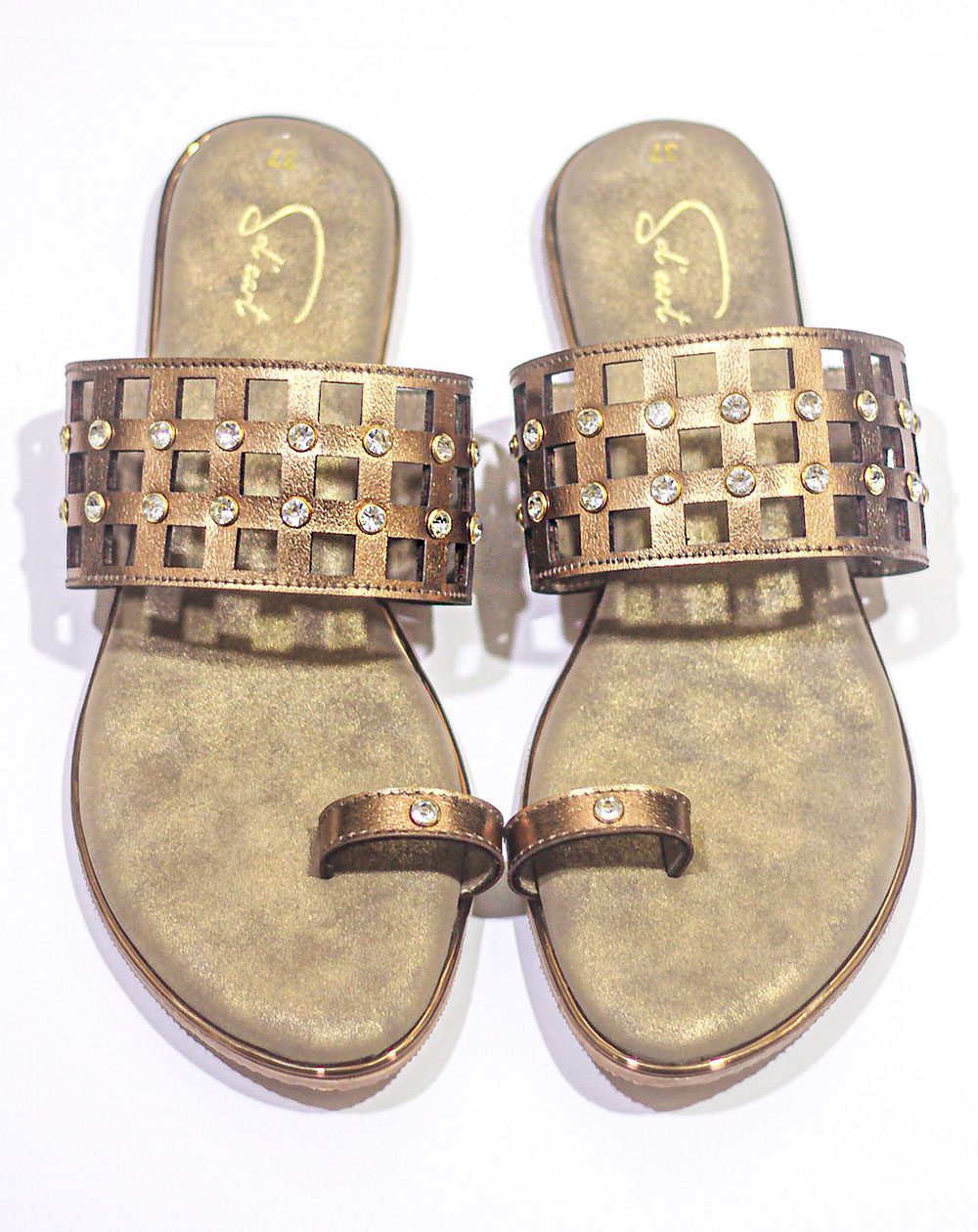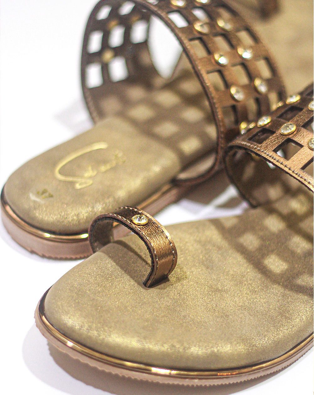 This bronze metallic pair features a toe holder and and geometric cutwork strap that is adorned with stones. While it looks minimal and elegant, it has the power to add...