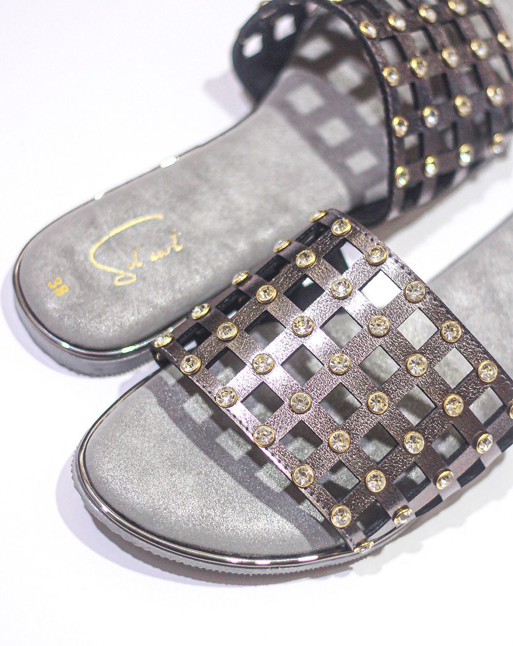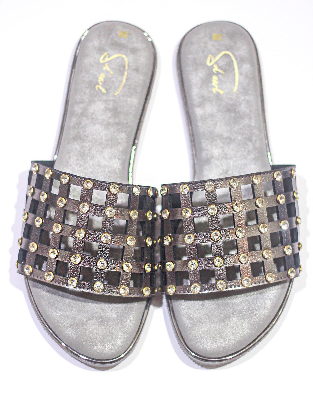 This grey metallic slider features a geometric cutwork strap that is adorned with stones. While it looks minimal and elegant, it has the power to add some serious zing to...
