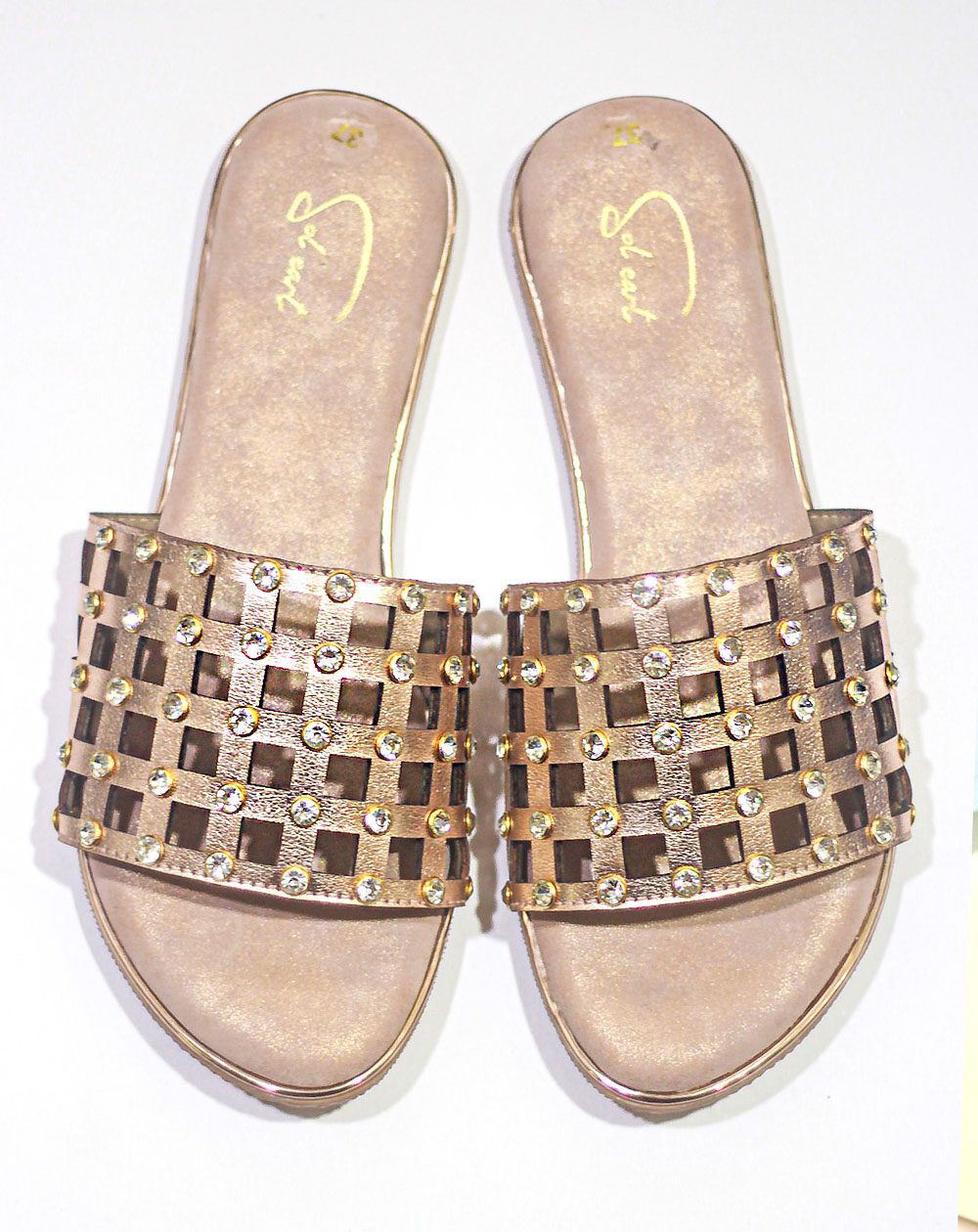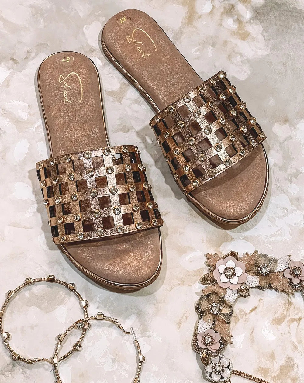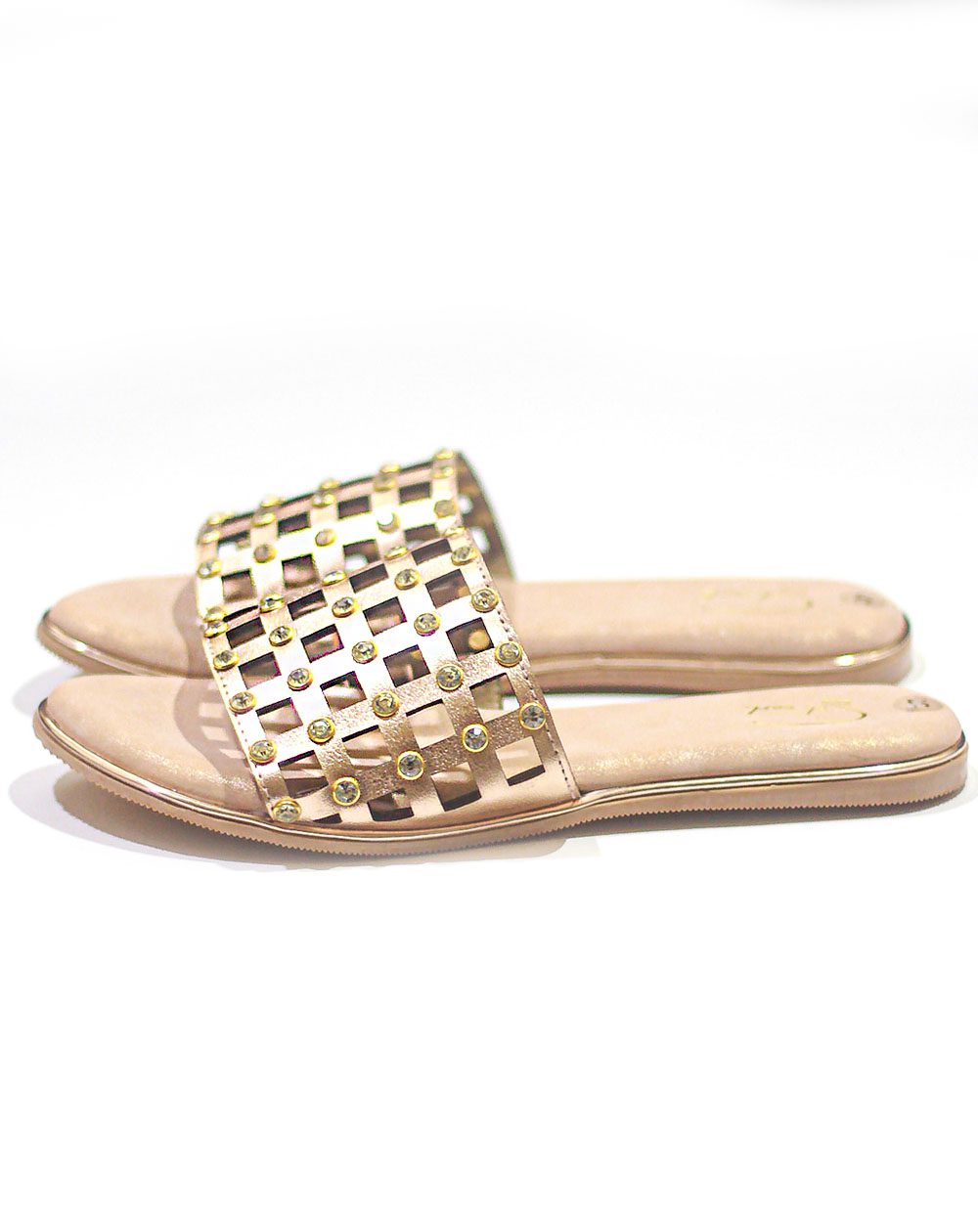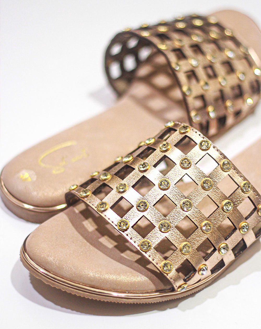 This rose gold metallic slider features a geometric cutwork strap that is adorned with stones. While it looks minimal and elegant, it has the power to add some serious zing to your festive look. It’s an all-around pair that can work well with Indian and Western attires.