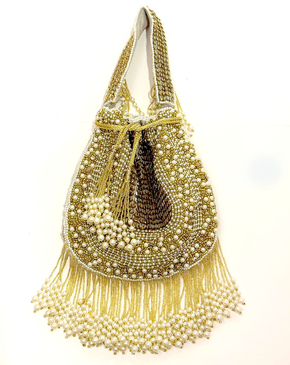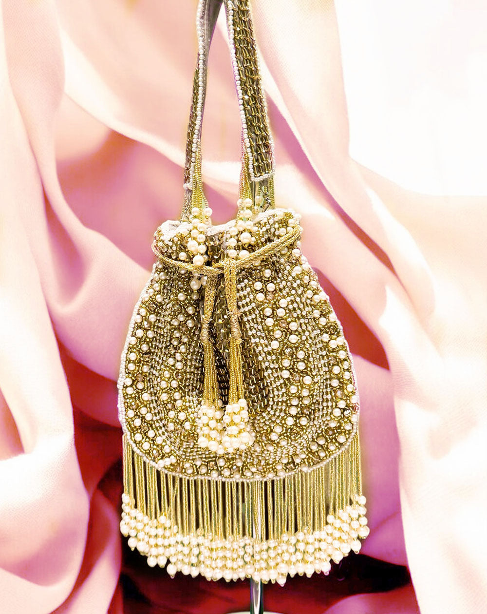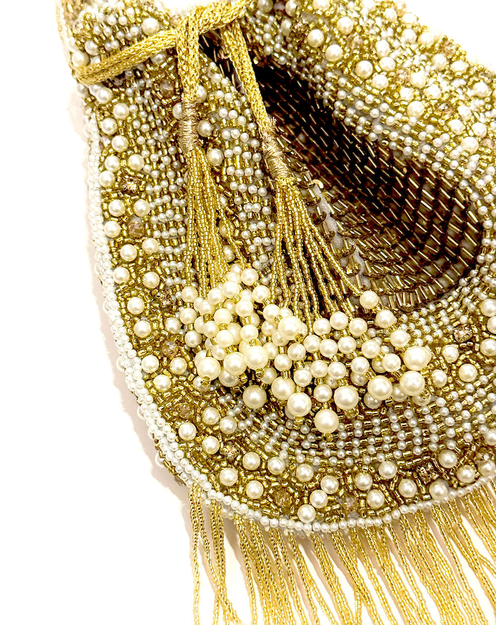 The Celebration Gold Potli arrives like a little firecracker of festivity, dressed in shimmering gold beadwork and crowned with generous pearls that gleam like they’ve been collecting blessings. Its drawstring silhouette keeps the charm rooted in tradition, while the fringe sways with a confident sparkle every time you move. This is the piece that turns Indian wear into a full-fledged moment.