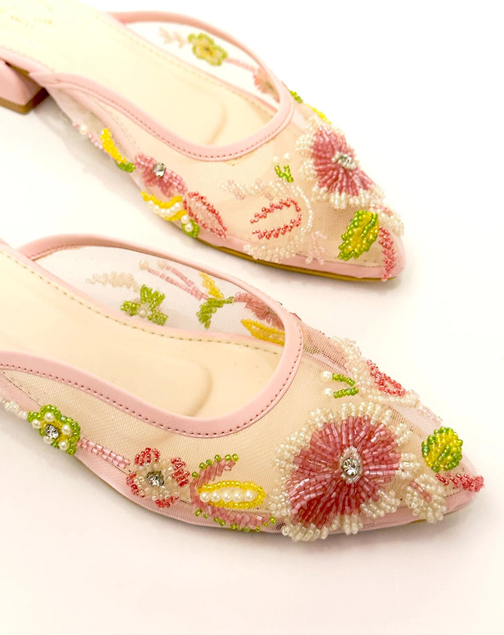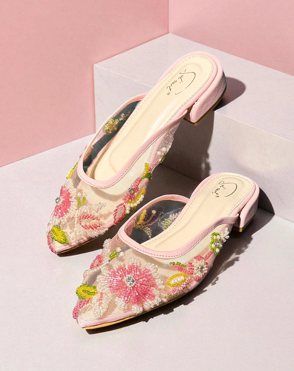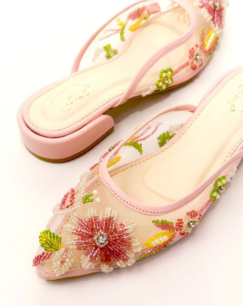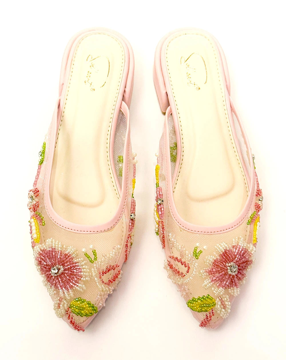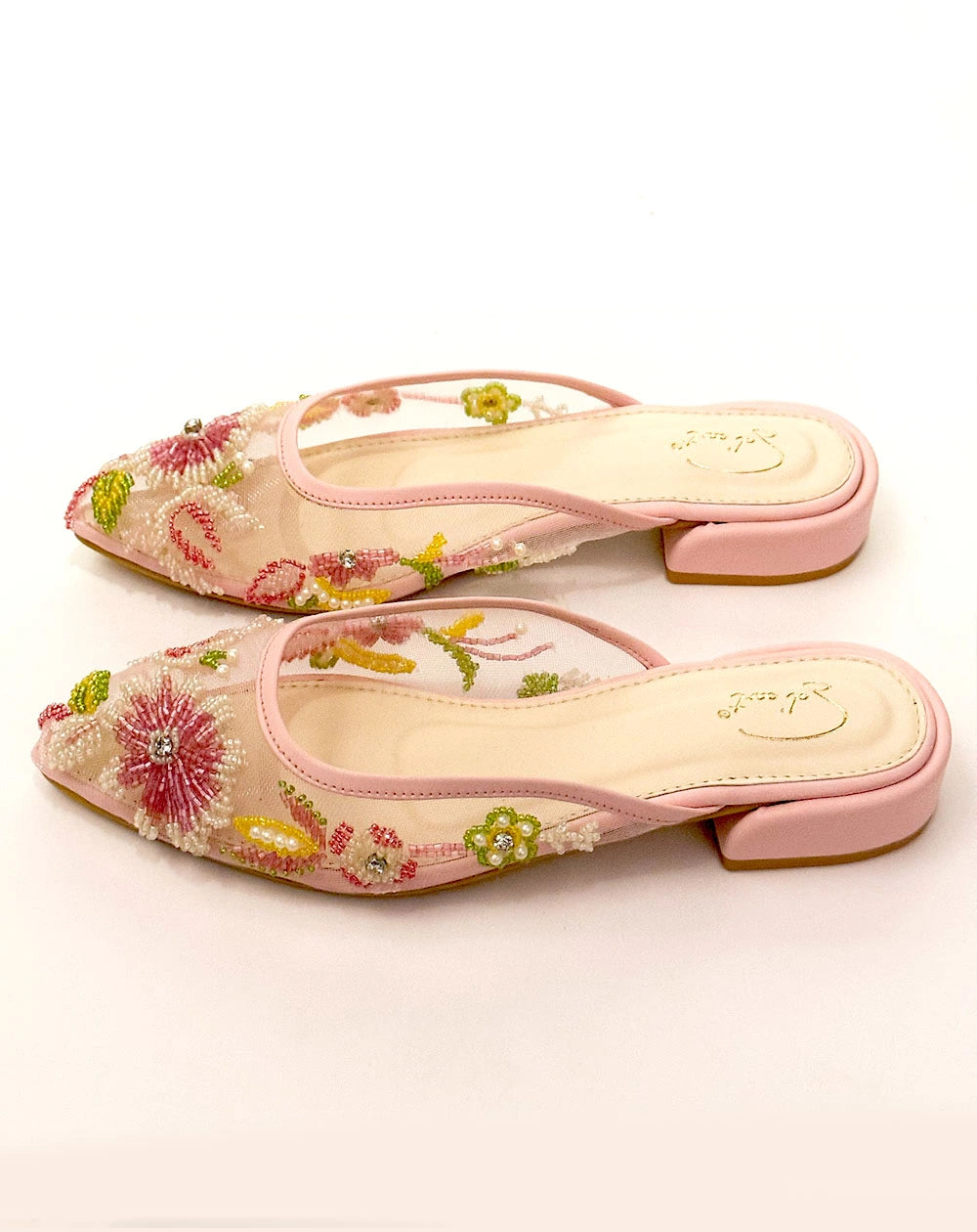 Dreamy, delicate, and oh-so-chic, the Chantilly mules are a fairytale for your feet. With a soft pink base and a sheer mesh upper embroidered with floral beadwork in shades of blush, white, and green, they’re pure romance in shoe form. Pretty yet playful, they’re made for the days you want to feel like you’re walking on petals.