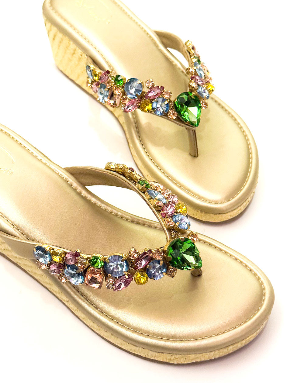 The Crown Affair Gold steps in like a party perched on a platform. Its sunlit base brings the shine, while the jewel-encrusted strap bursts with pink, blue, green and yellow stones that feel like a tiny festival glittering across your feet. Equal parts playful and glam, this fancy flip-flop–meets–statement shoe lifts any outfit into celebration mode. It’s the kind of pair that turns even a simple look into a crowned moment.