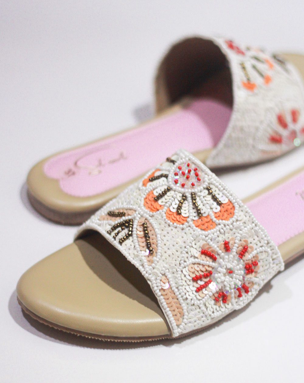 Perfect for your casual looks is one of our most cherished sliders - Flower Power. The shoes features an artistic design of beads that are inspired by the late sixties...