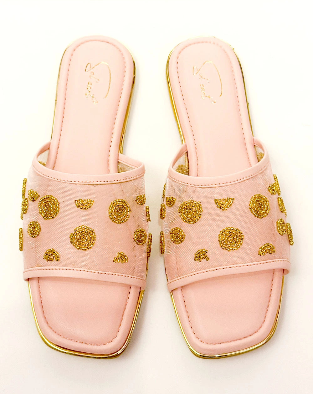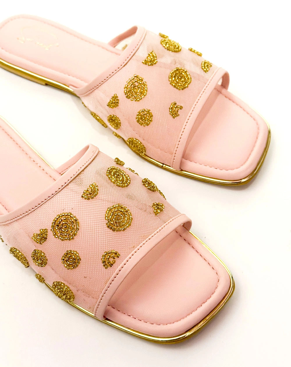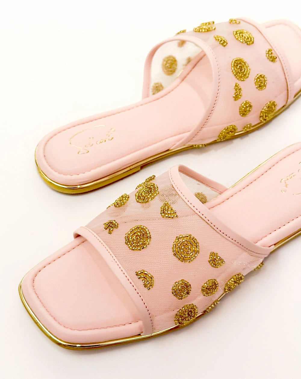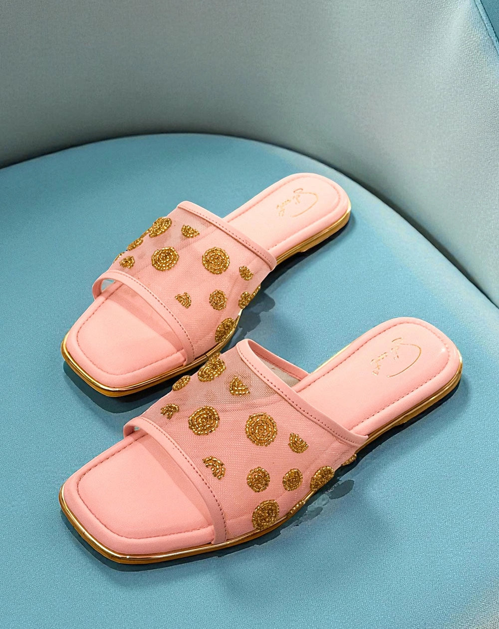 Playful yet polished, the Lady Dot Pink sliders bring a touch of whimsy to your every step. With a soft mesh upper and delicate gold beaded embroidery forming chic circular patterns, these slides blend comfort with effortless charm. Perfect for brunches, coffee runs, or any casual day you still want to sparkle.