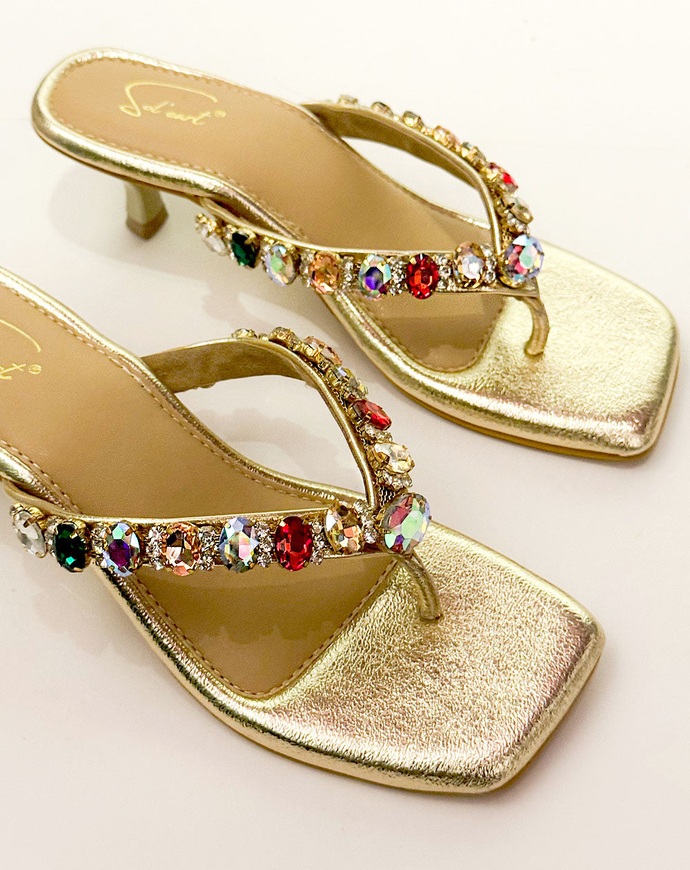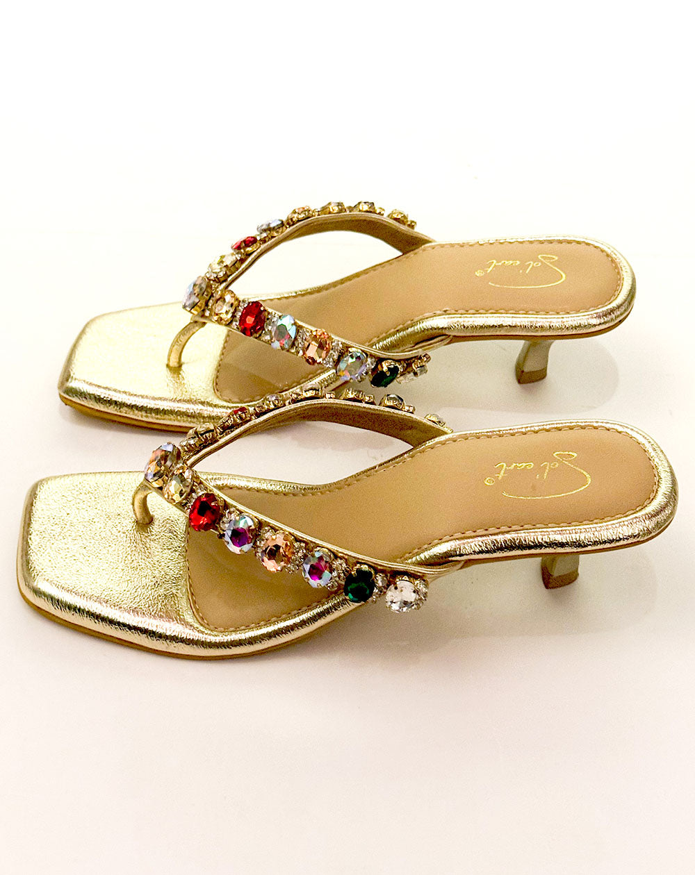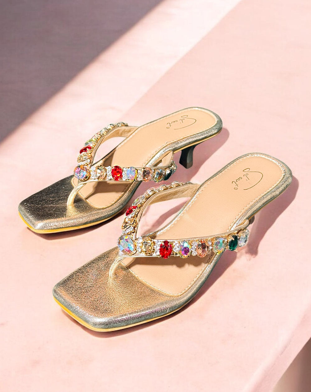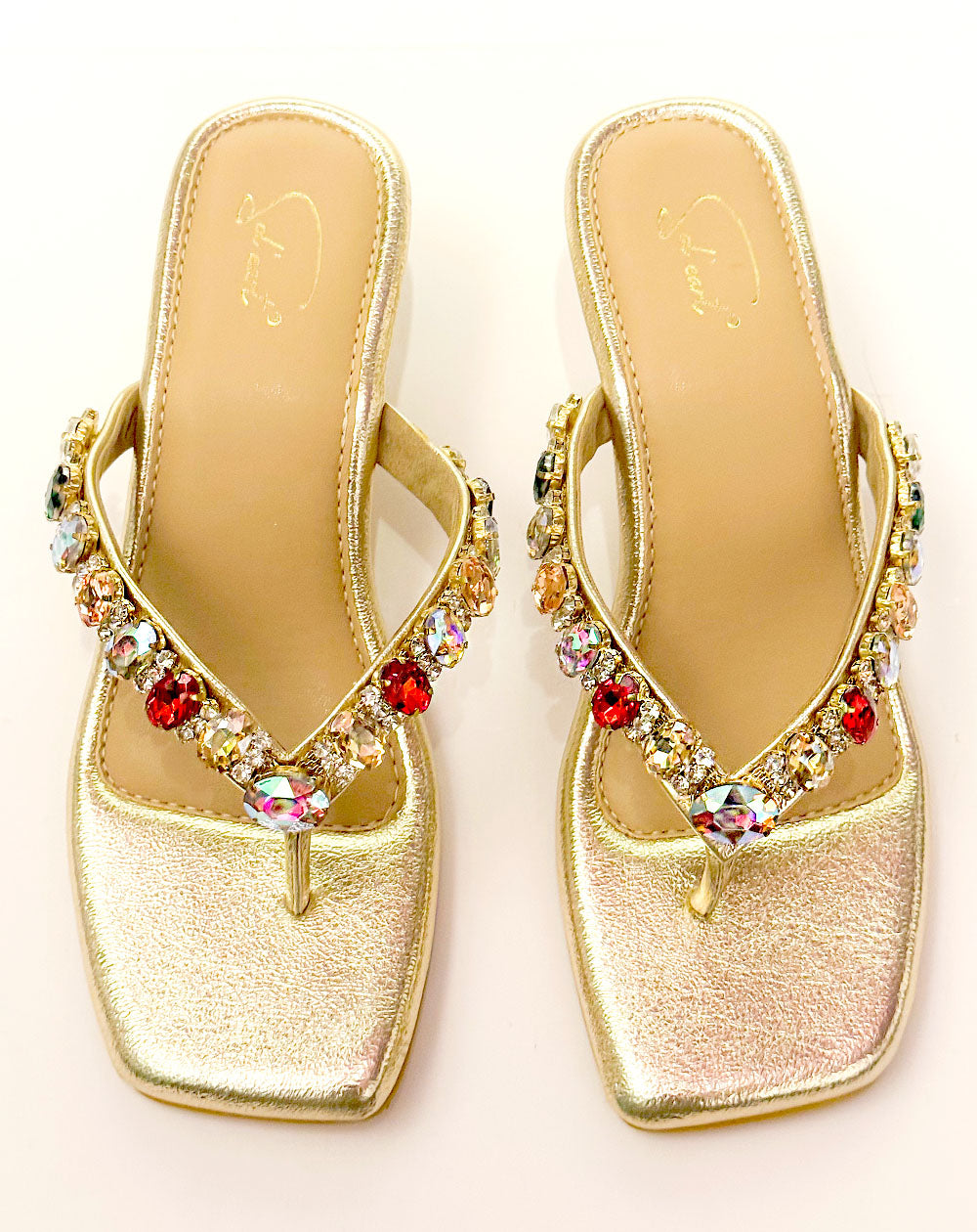 The Lady Luxe heels glide in with a quiet wink of glamour, perched on dainty gold kitten heels that feel light as a secret and twice as fun. The jewel-studded strap sparkles with multicoloured stones that catch every bit of light, turning each step into a tiny firework. Chic, festive and effortlessly dressy, this fancy flip-flop silhouette brings polished glamour without losing its playful soul.