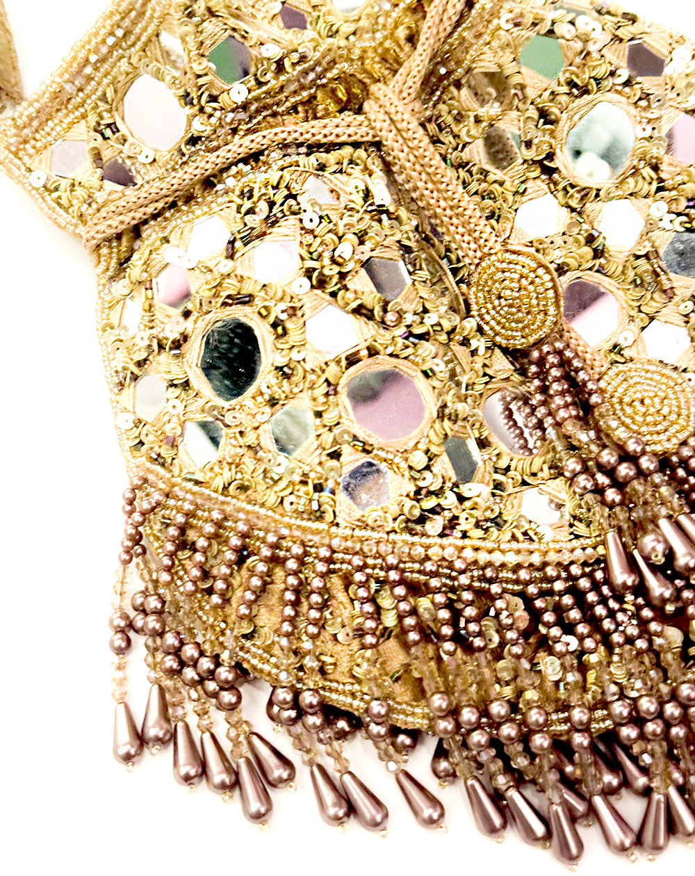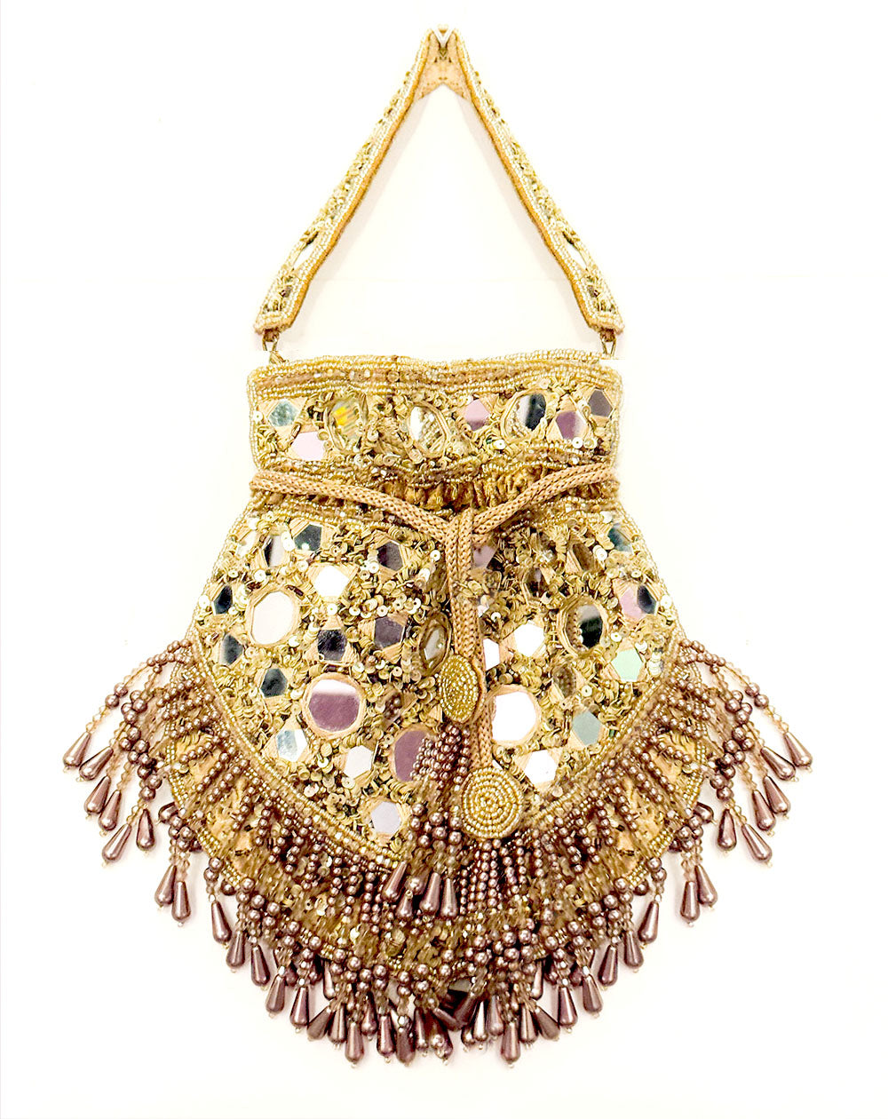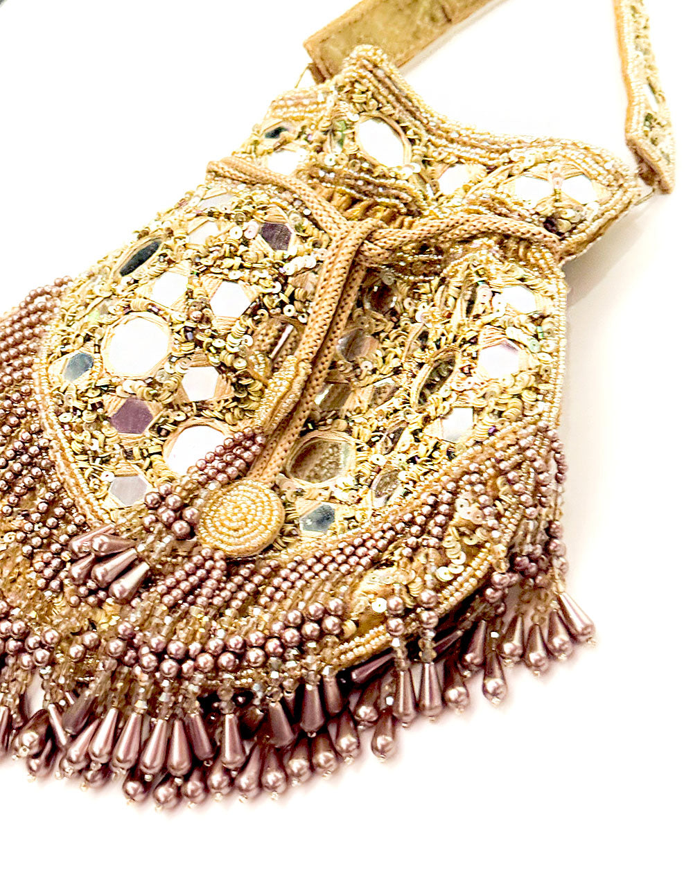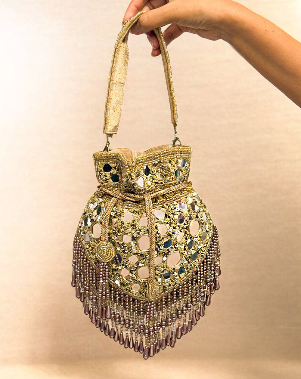 The Mirror Magic Bag lives up to its name with an enchantment all its own. Bronze and gold embroidery ripple across the surface like golden hour captured in thread, while the mirrors spark little bursts of light with every angle. The fringe at the bottom adds a playful, swaying finish that brings the whole piece to life. Rich, radiant, and impossible to overlook, this is the kind of statement accessory that transforms any Indian ensemble into something instantly spellbinding.