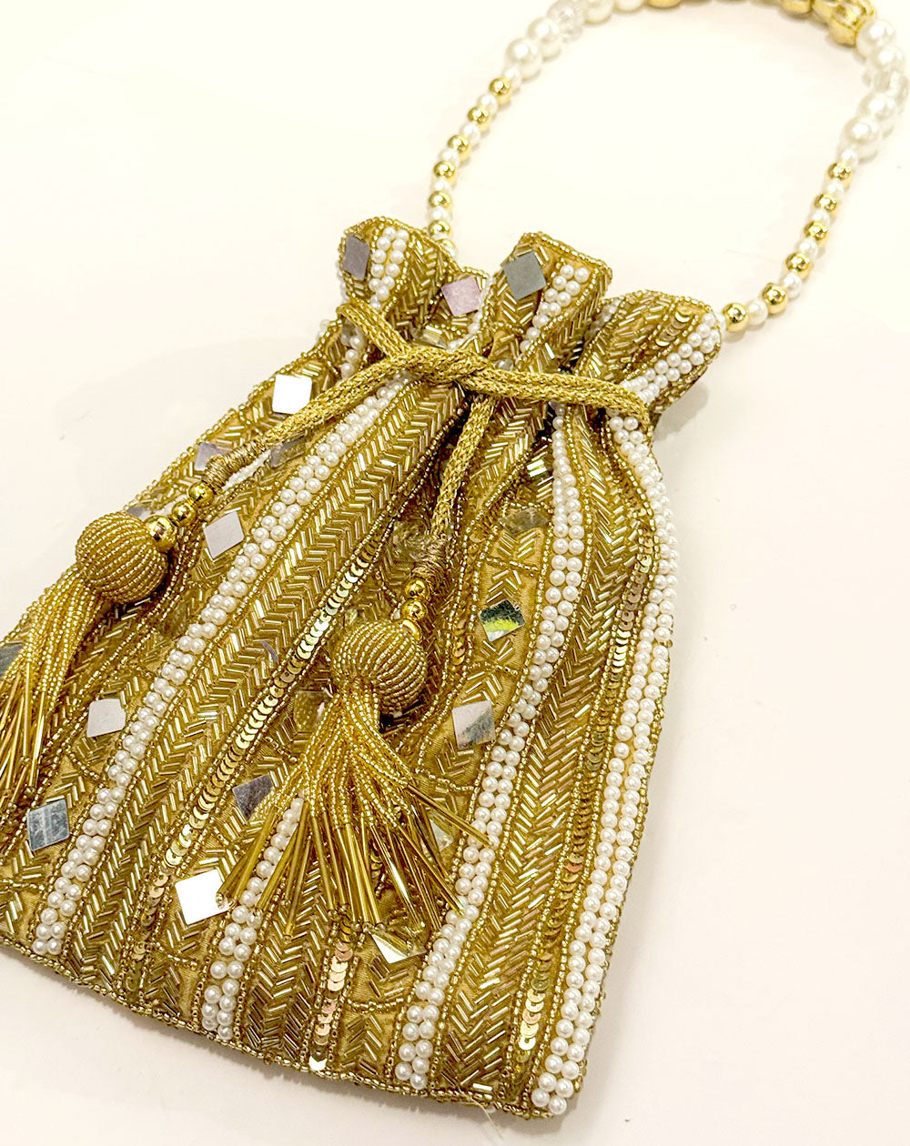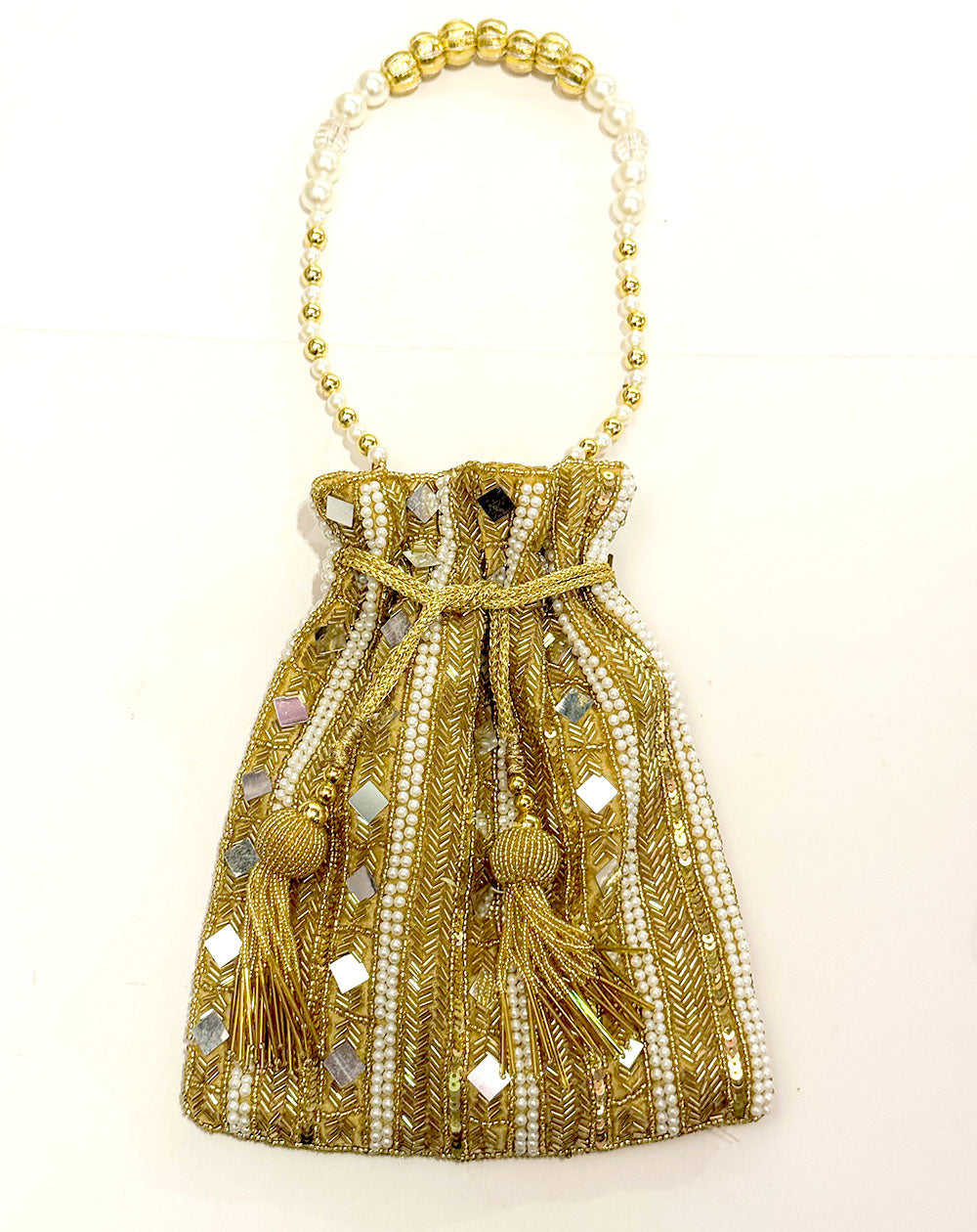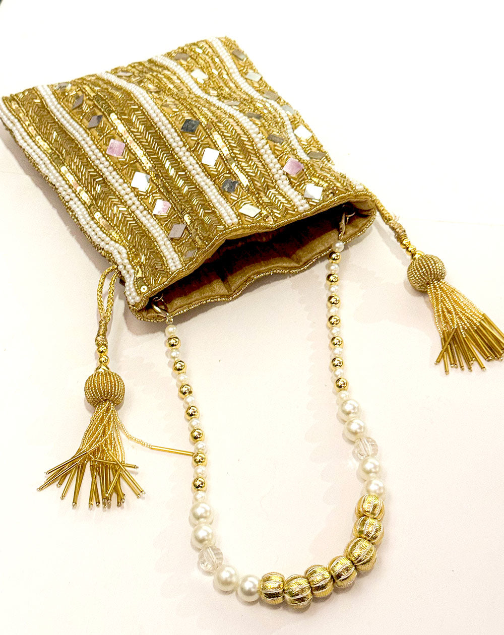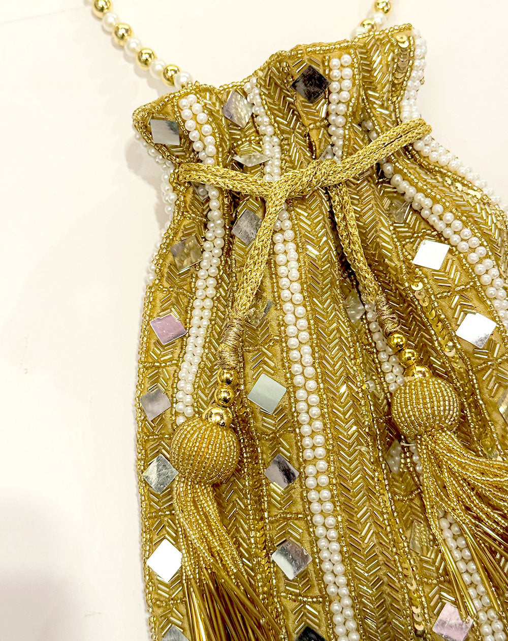 The Mirror Magic Bag glows like a pocket-sized celebration. Drenched in gold beads and dotted with mirrors that sparkle at every turn, it carries an irresistible festive energy. Pearls add a touch of softness and charm, balancing the shine with elegant detail. Thoughtfully crafted and beautifully radiant, it’s the perfect companion to Indian outfits, bringing just the right blend of tradition, glamour, and luminous flair.