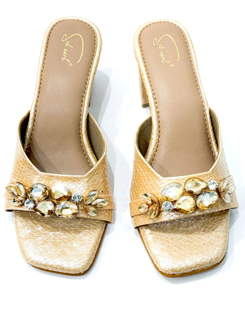 Step into brilliance with Radiant Luxe, a gold heel that lives up to its name. Its textured surface glimmers under every light, while gold and silver crystals are meticulously encrusted...