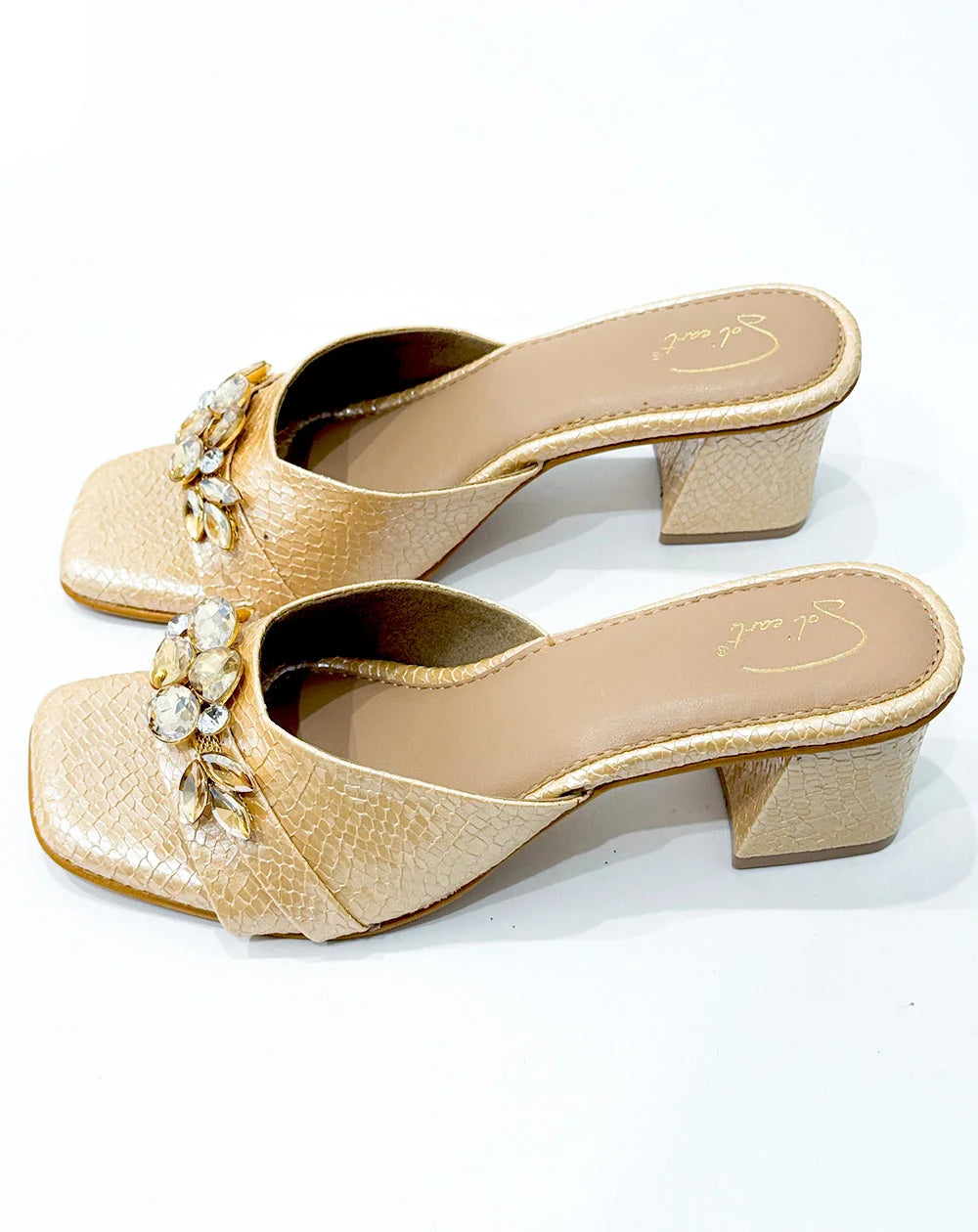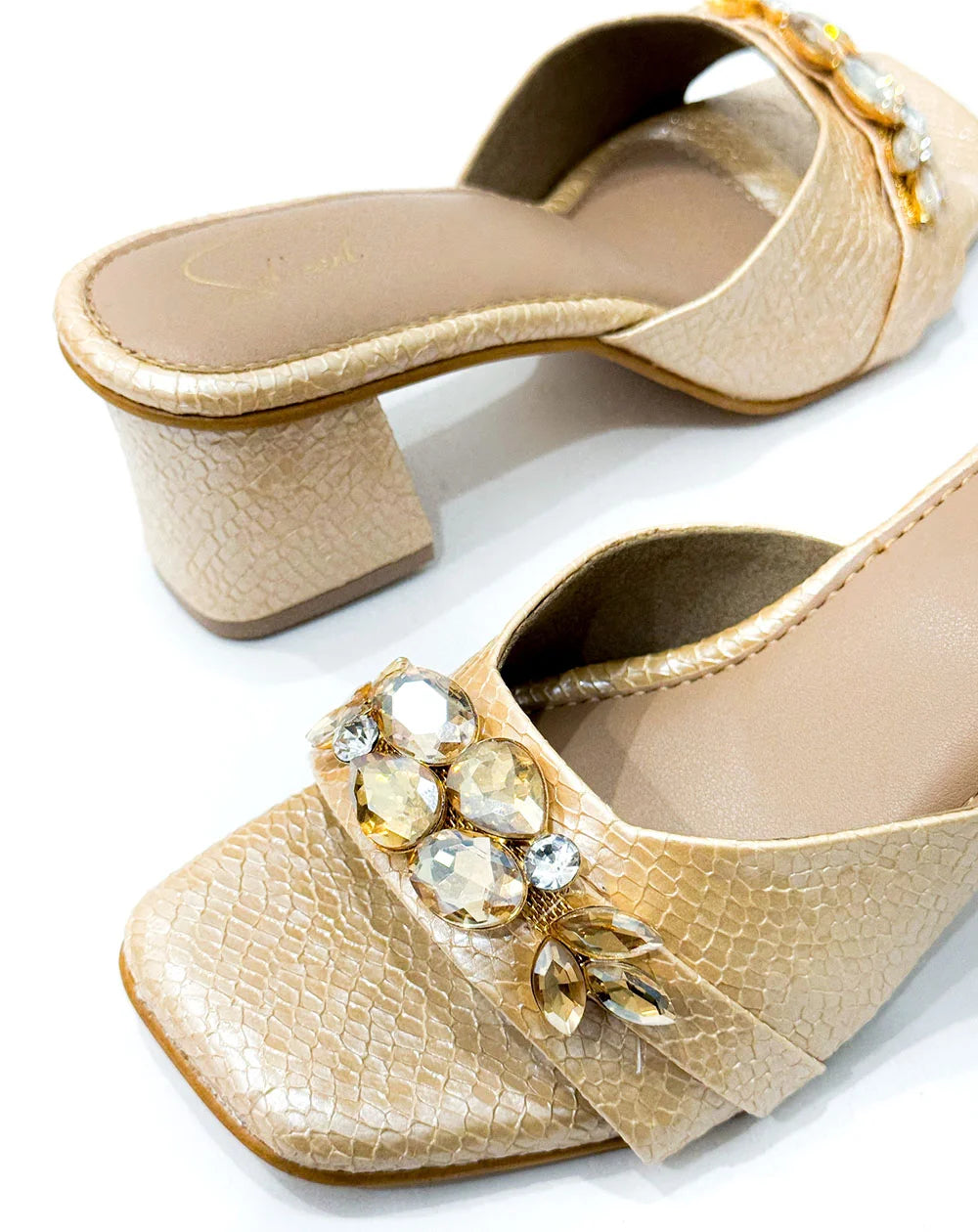 Step into brilliance with Radiant Luxe, a gold heel that lives up to its name. Its textured surface glimmers under every light, while gold and silver crystals are meticulously encrusted to create a dazzling two-tone shimmer. Bold, glamorous, and commanding, this pair is made for evenings that demand a show-stopping entrance.