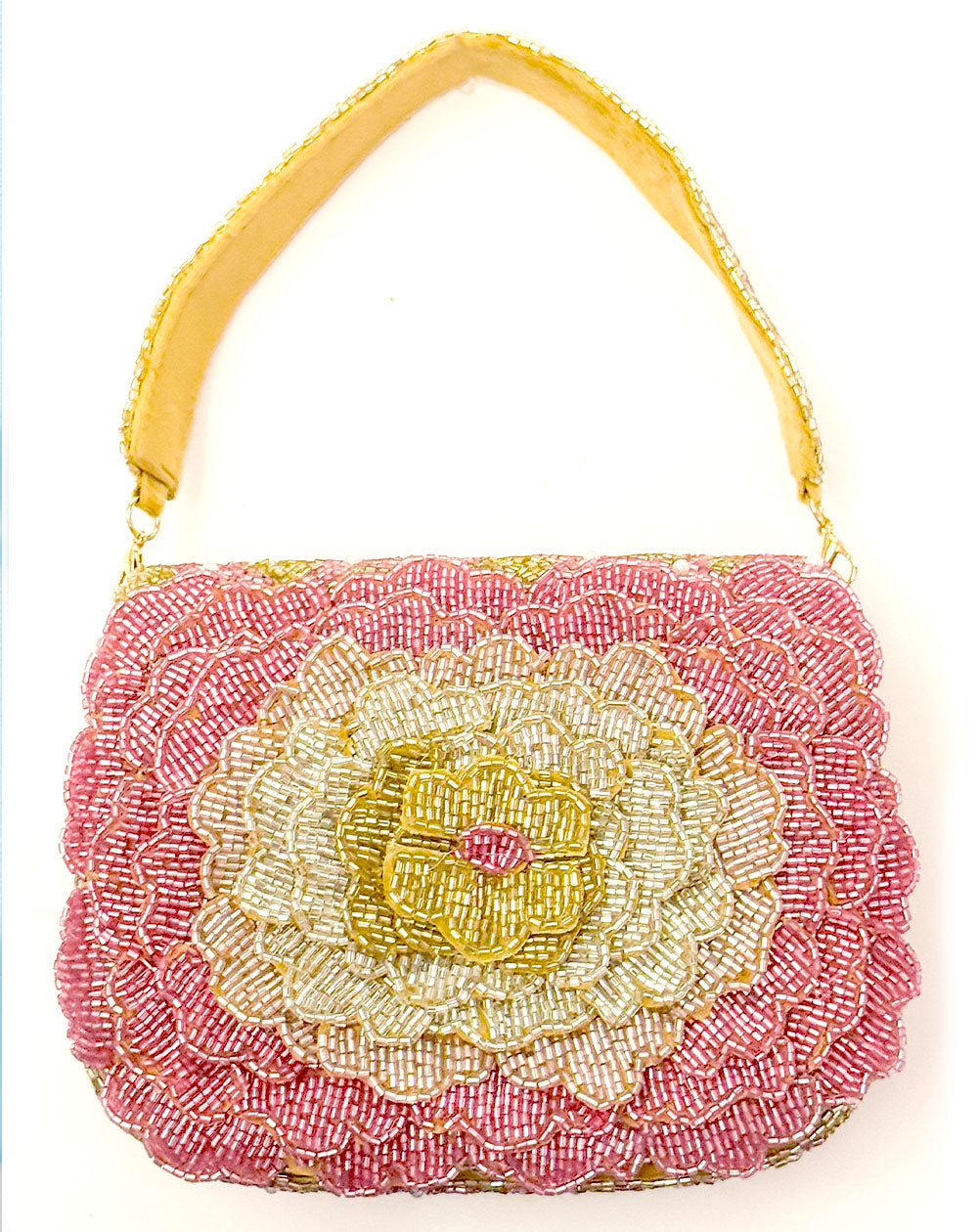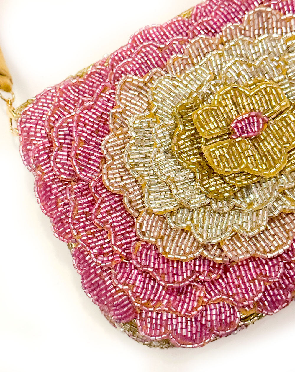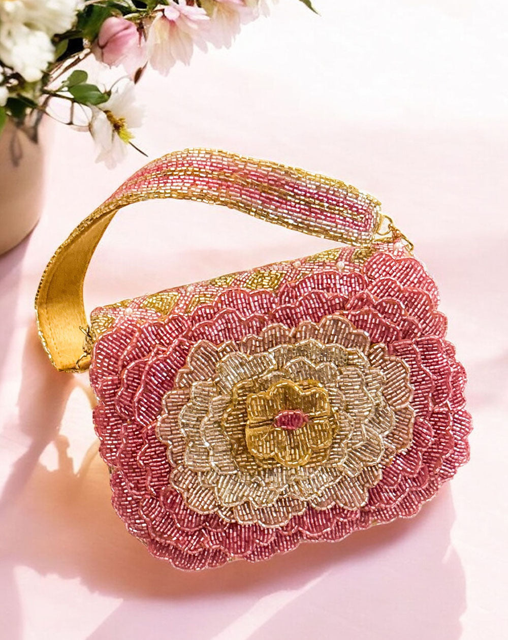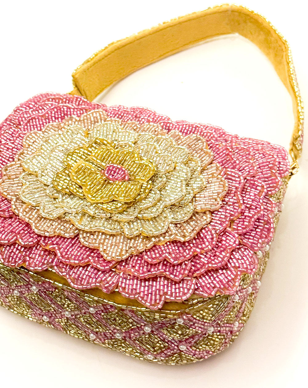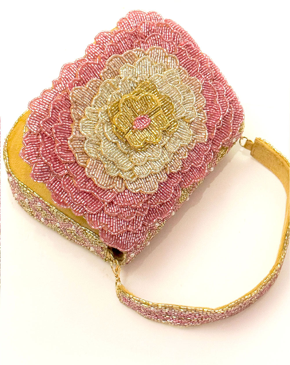 The Rosette Box arrives with a flirtatious twirl, wrapped in pink, gold, and silver beads that bloom into a playful rosette pattern. Its structured silhouette gives the design a polished, modern edge, while the florals add that soft, feminine wink. Petite, pretty, and full of charm, it’s the kind of statement piece that dances beautifully with Indian wear and adds a touch of sparkle to every celebration.