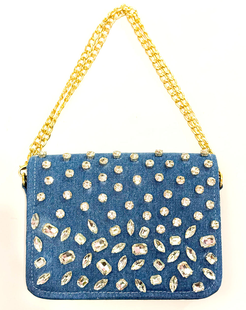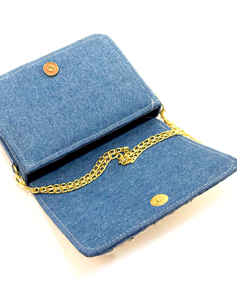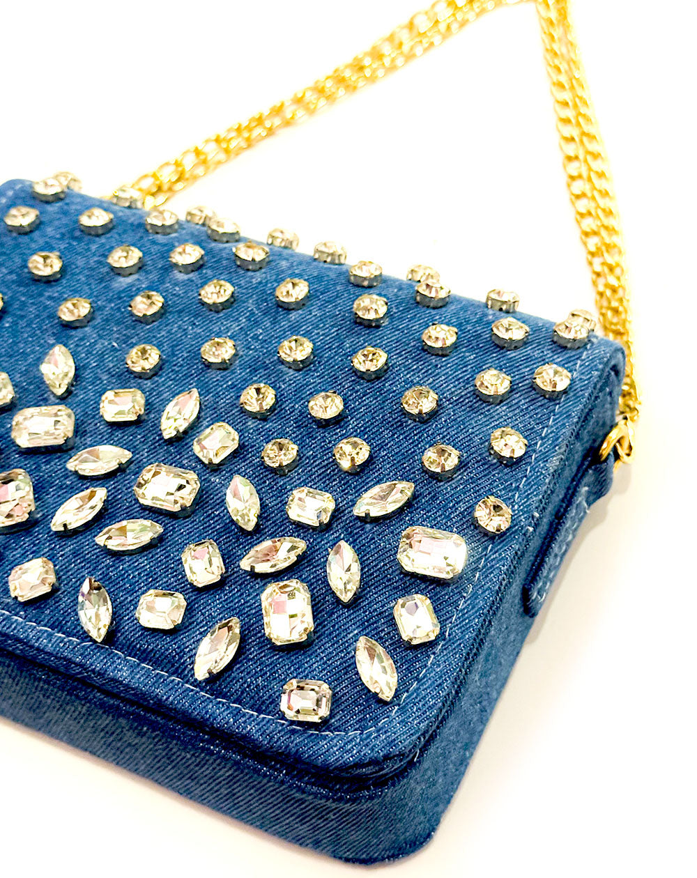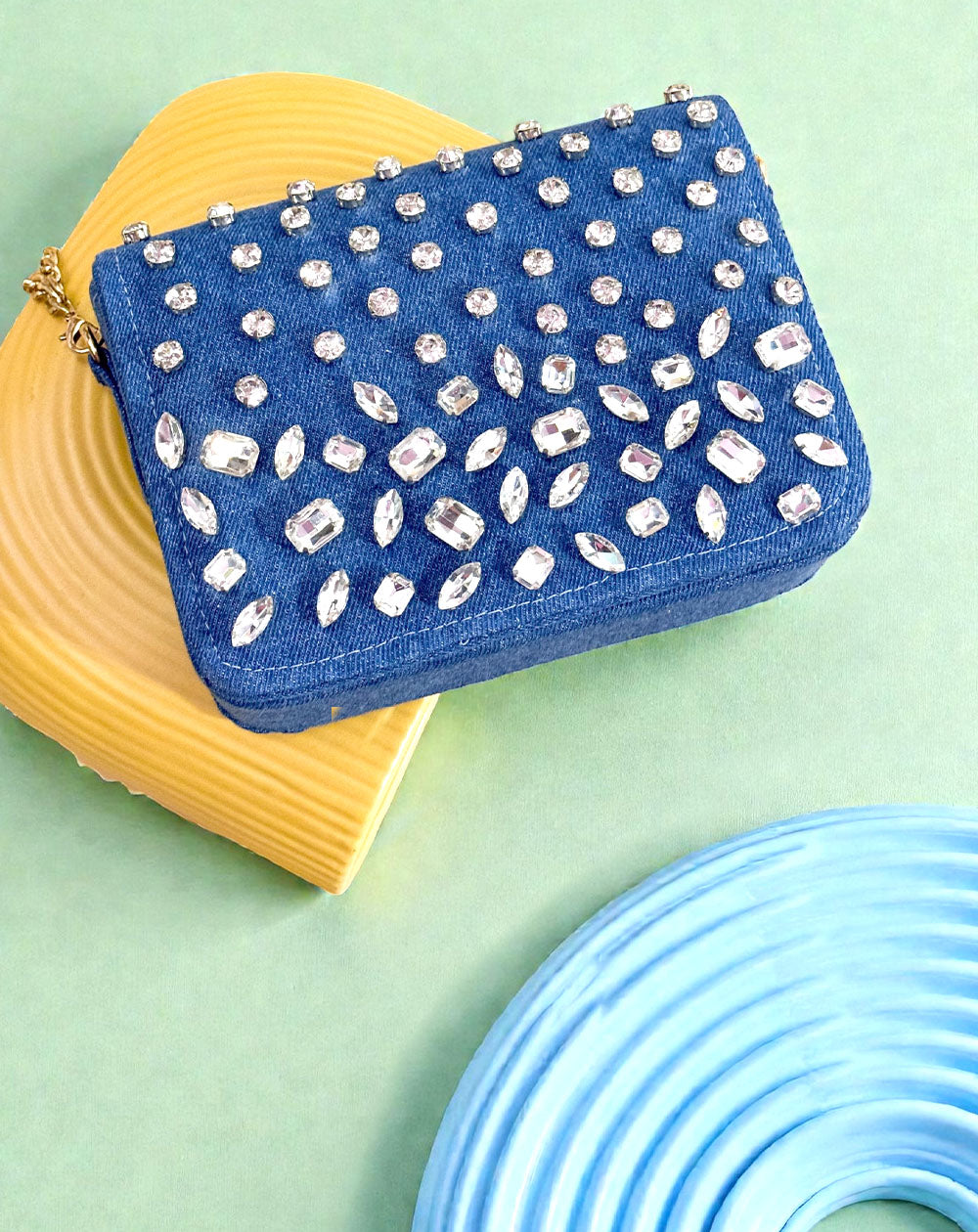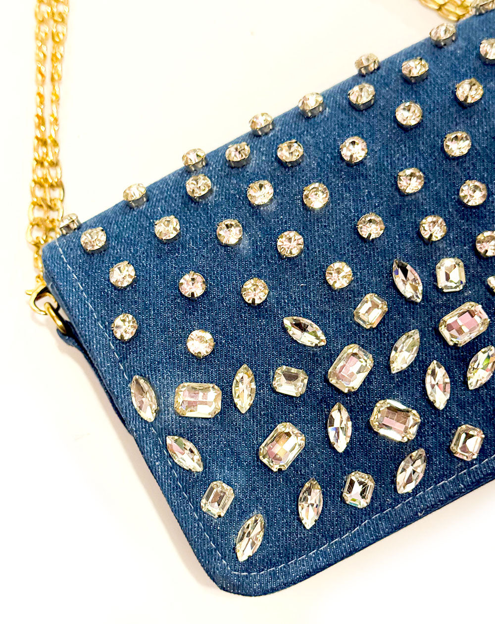 The Starlight Denim Dark White sling lights up classic blue denim with a cool, crystalline glow. White and silver stones flicker across the surface like fresh stardust on twilight, giving the bag its edgy, modern attitude. Easy to style for casual days yet striking enough for a night out, it brings a clean, electric shimmer to every look. Effortless, bold, and quietly dazzling — denim with a cosmic twist.
