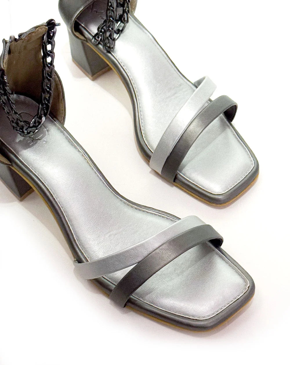 Cool, confident, and effortlessly luxe, Veronica Silver brings shimmer with an edge. The sleek metallic silver design is paired with two golden chain ankle straps that let you add charms...